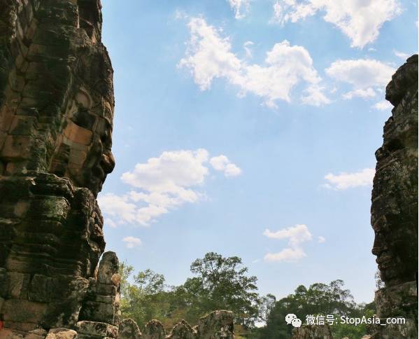巴戎寺的中心高台上,是一个有49座(现存37座)四面佛塔塔的塔林,加上周围5座门塔,一共54座四面佛塔,200个左右微笑的面孔俯视着巴戎寺和吴哥。我看右边那座石雕摇摇欲坠,挺悬的。