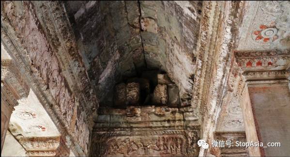 整个庙宇是用大石一块块砌成,没有使用任何石灰水泥,更没有钉子梁柱。那个时代,高棉人还没有圆拱形梁柱的构思,只用了三角型的叠涩拱梁,所以间跨都不大,看来都是一间间小房子。