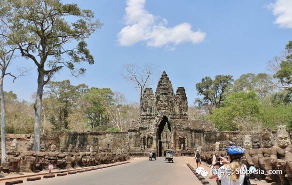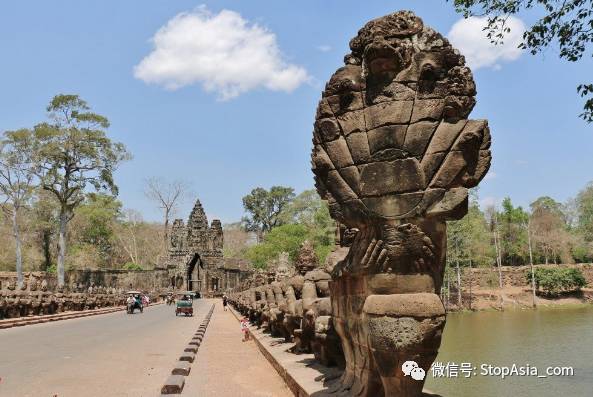 吴哥通王城南门,护城河上架有石桥,桥的两侧栏杆上各有一排54个石雕的半身像,一边代表神灵,另一边代表恶魔,他们手上拉着眼镜蛇化身的巨蛇王。据说宽约百米的护城河,在古时养有很多鳄鱼,是用来抵御敌人进攻的。