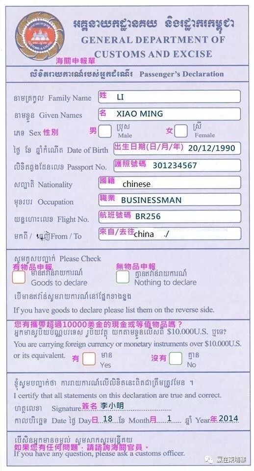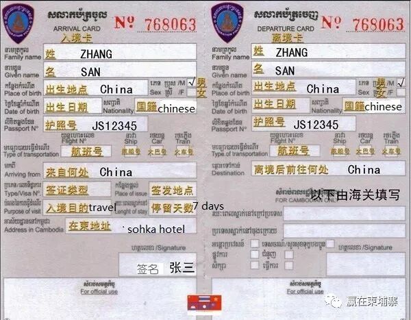 出入境卡分左右,左侧填完,入境的时候被边检撕下拿走,右侧边检会订在你的护照柬埔寨签证页旁。左右侧都必须填写完整,文字为英文和柬埔寨文字。填写的内容有,姓,名,出生年月,国籍,签证号码,职业,是乘坐什么工具(飞机,汽车,轮船),在柬埔寨的住宿地点等等