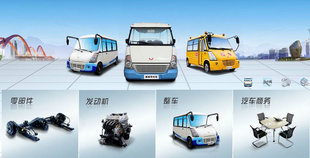 ● 五菱整车产品包括客车、微型货车和观光车,客车系列包括迷你巴士和中型巴士,适用于旅游接待、公路客运、支线公交、企业通勤等。