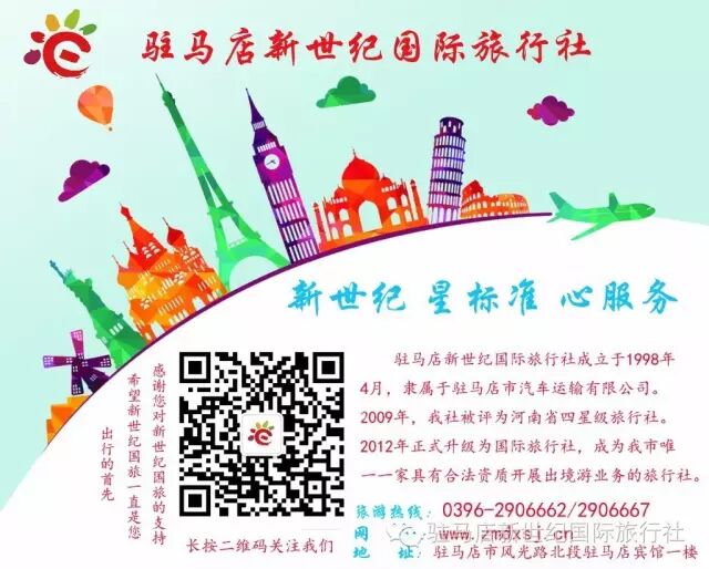 报名地址:驻马店市风光路北段新世纪国际旅行社。