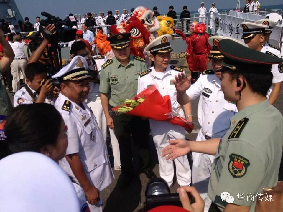 上午10时许,,靠泊码头。柬埔寨海军为中国海军护航编队举行了隆重的欢迎仪式。柬军乐队奏乐欢迎,柬海军代表、、中资机构人员和华人华侨等到码头迎接,编队领导走下舷梯,与欢迎人员见面,互致问候,并接受中柬两国女青年代表献花。随后,使馆人员、中资机构和华人华侨登舰参观。