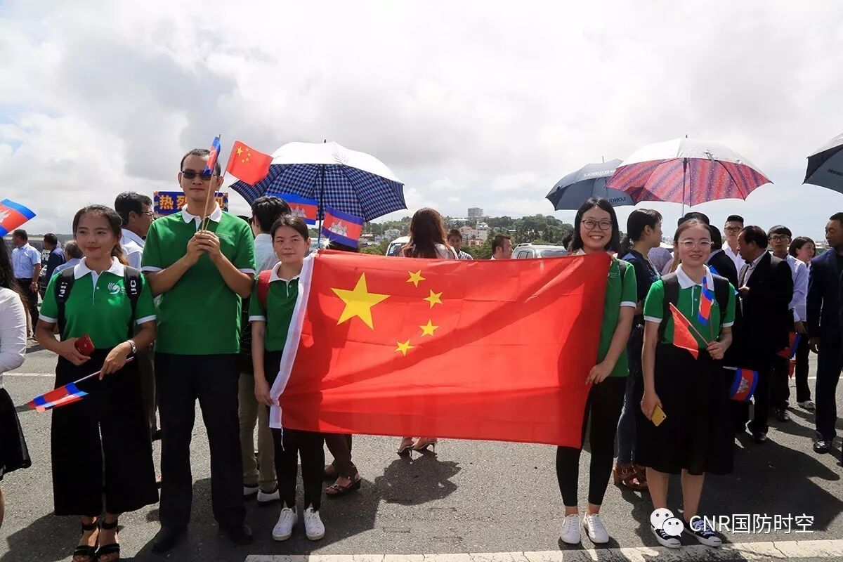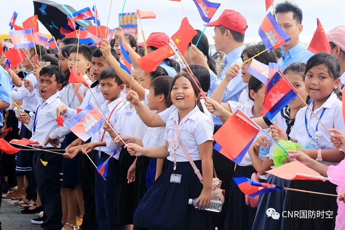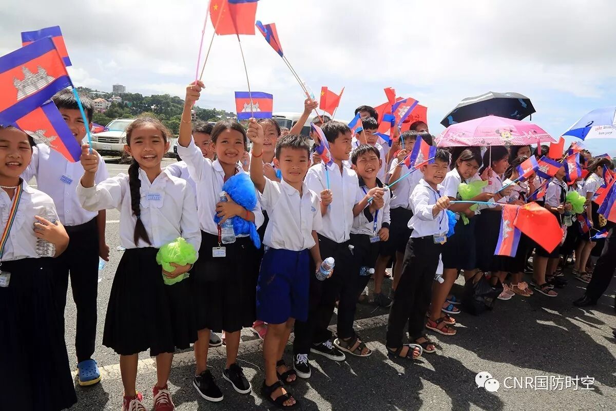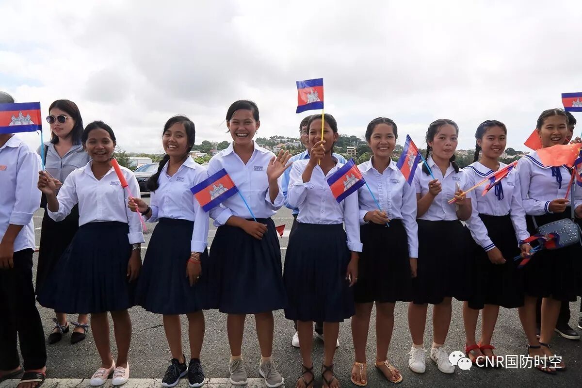 柬埔寨小学生挥舞两国国旗欢迎中国海军到来(徐晓羽摄)