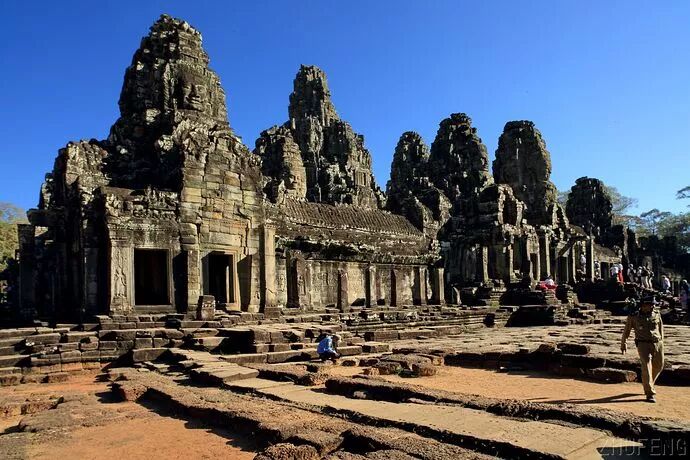 早餐后,游览高棉王国古老的都城—大吴哥城:【巴戎庙】,这些微笑的面容据说是加亚华曼七世与尊容的融合体。)【十二生肖像】、【斗象台】(斗象台规模很大,全是用巨石垒成的很大一片建筑,在过去是举行庆典仪式的地方,也是皇族政要迎宾检阅的地方)。
