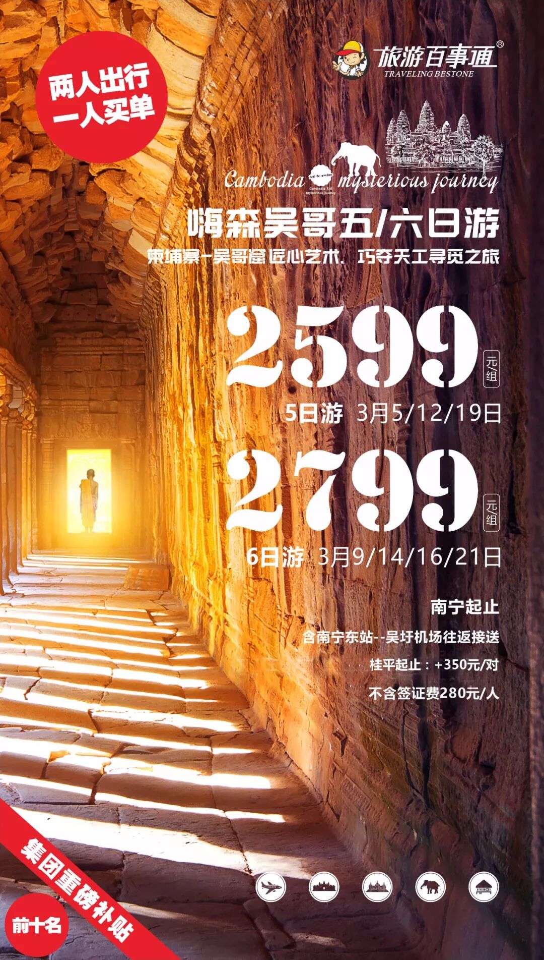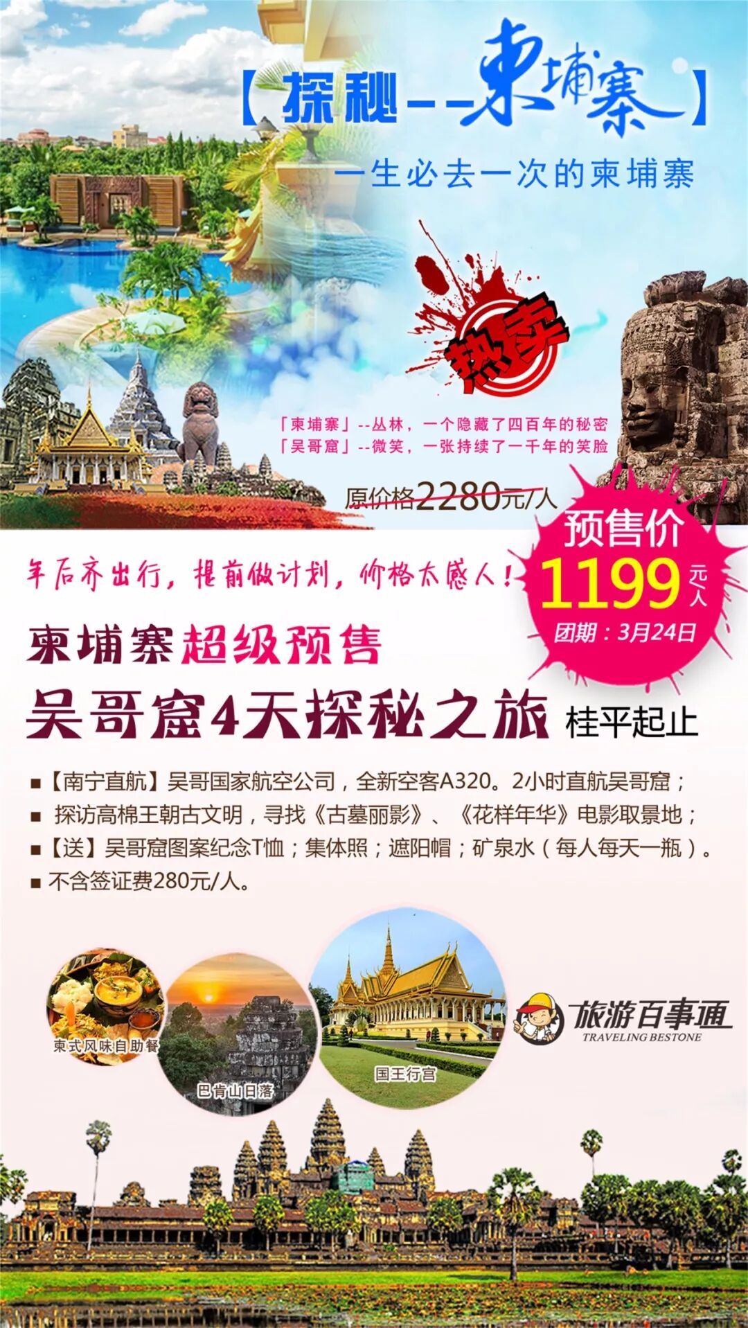 桂平集中乘汽车(或动车)前往南宁吴圩国际机场,搭乘直航包机飞往世界七大奇迹之一。【吴哥窟】:它位于柬埔寨北部的【暹粒省】。它曾长期淹没于丛林中,直到1860年才由法国探险家根据中国古书(真腊风土记)之记载,深入暹逻北部寻找而发现,吴哥窟总占地近200平方公里,乃古高棉于吴哥古王朝全盛时期的不朽文明遗址,总建筑群占地24公里长,宽8公里,全城雕刻精美,有「雕刻出来的王城」美誉,与金字塔齐名为世界七大奇迹。