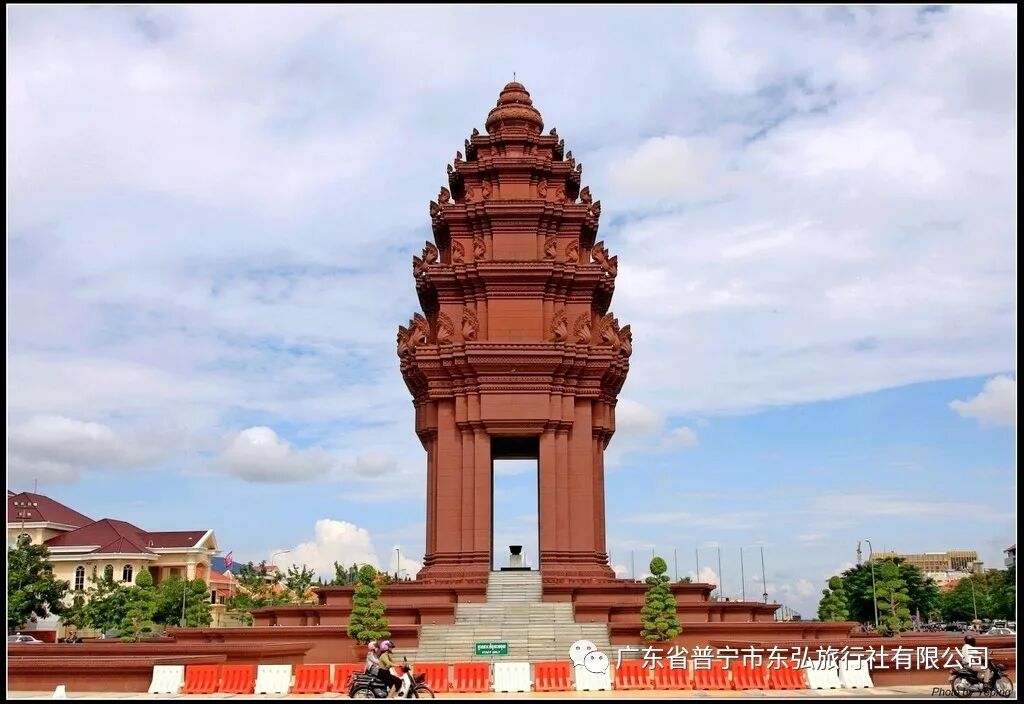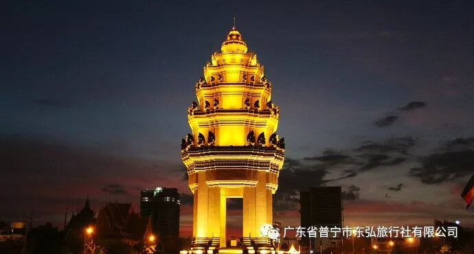【独立纪念碑】。由柬埔寨著名设计师凡·莫尼旺设计,于1958年动工兴建,1962年11月落成。整座纪念碑底座宽36米、高37米。每年独立节,柬埔寨国王或者国王代表都在此举行隆重的庆典,而来往的外国元首也多到这里献花圈。