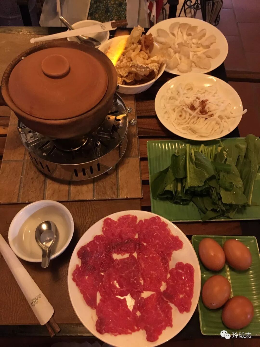 套餐里配有牛肉、蔬菜、豆腐衣、平菇、河粉等,调料很有特色,调制时会询问你是不是有忌口。
