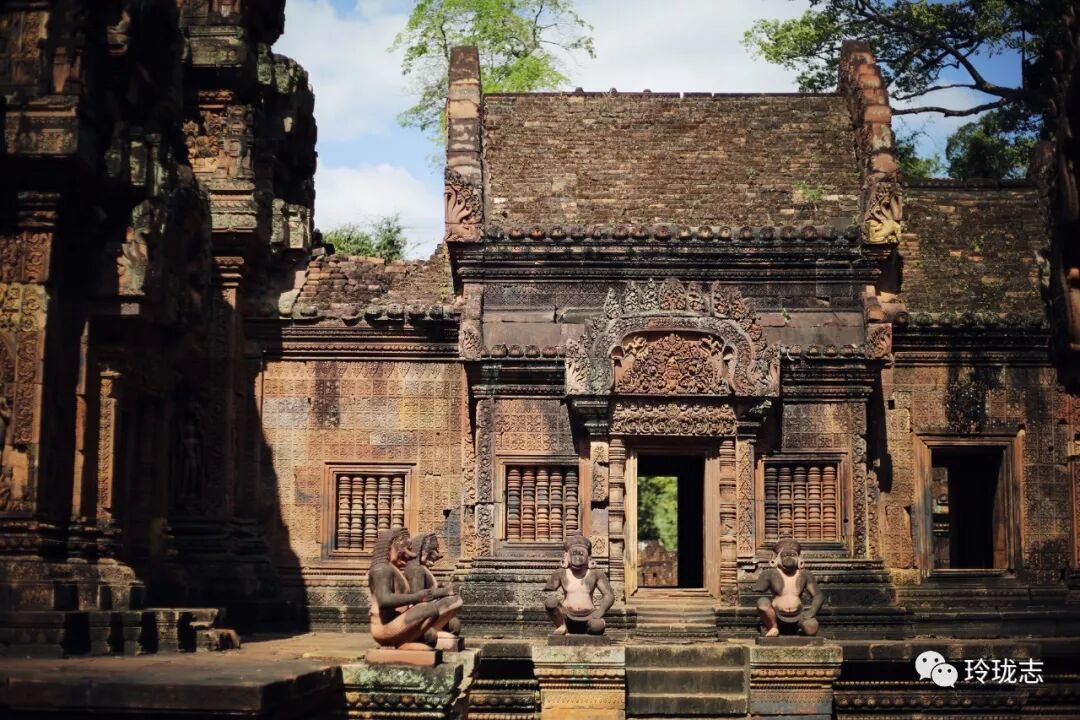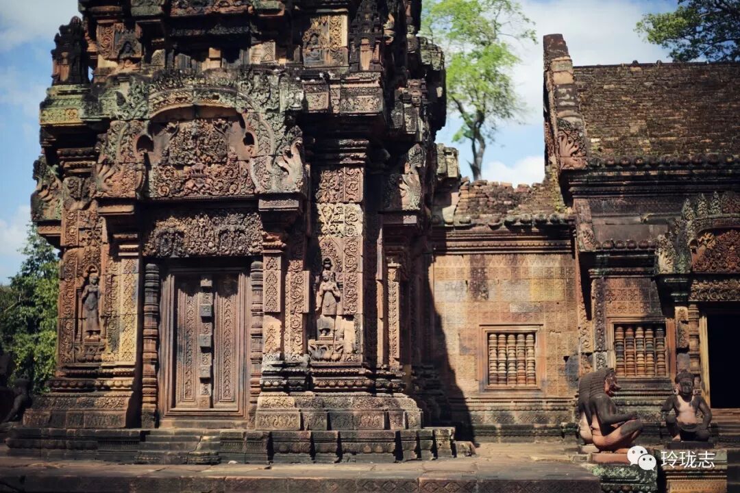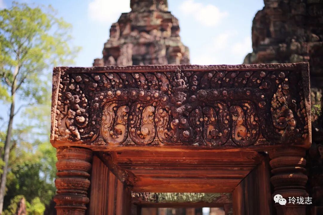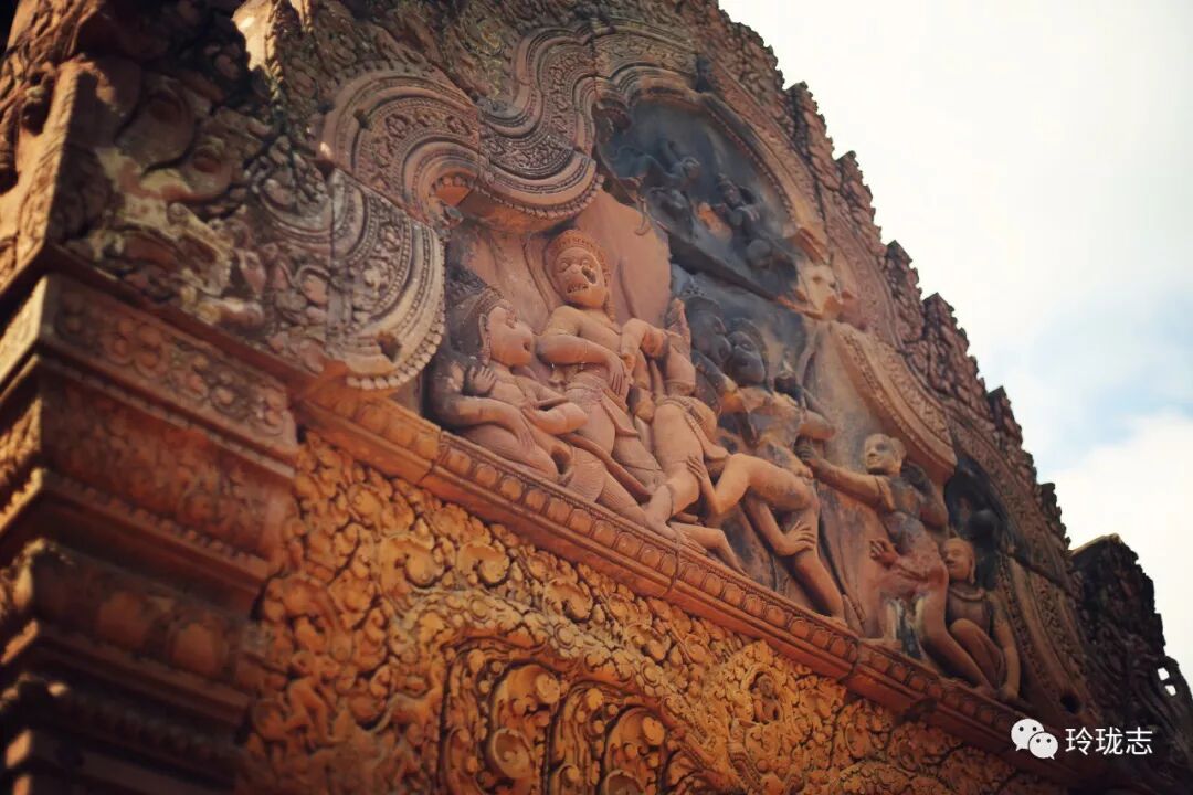 除了粉色砖墙,雕刻也是女王宫最有特色的地方。细腻而传神的雕刻充分展现了吴哥时期的雕刻功力。