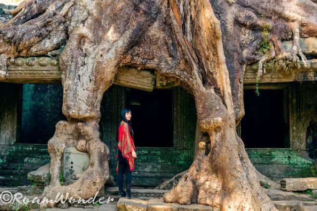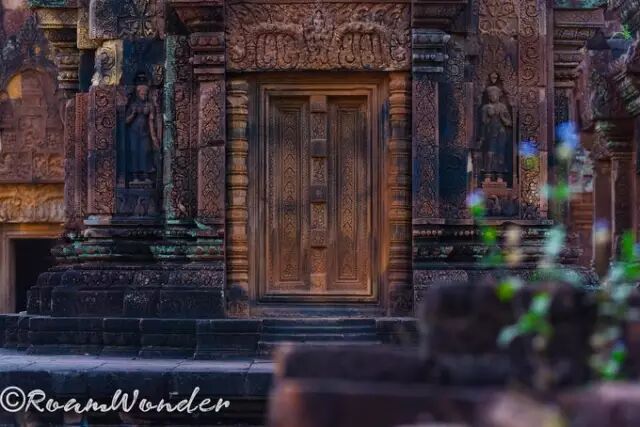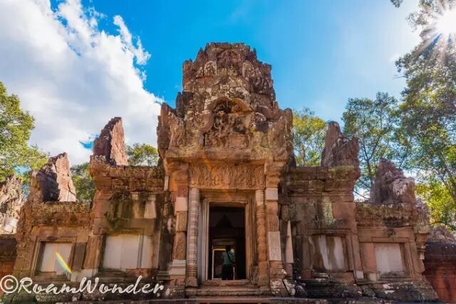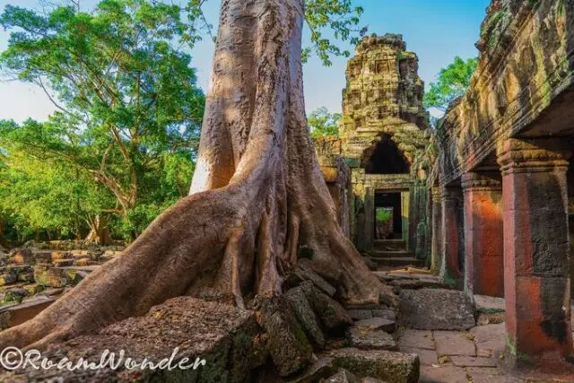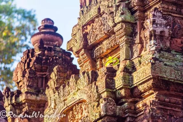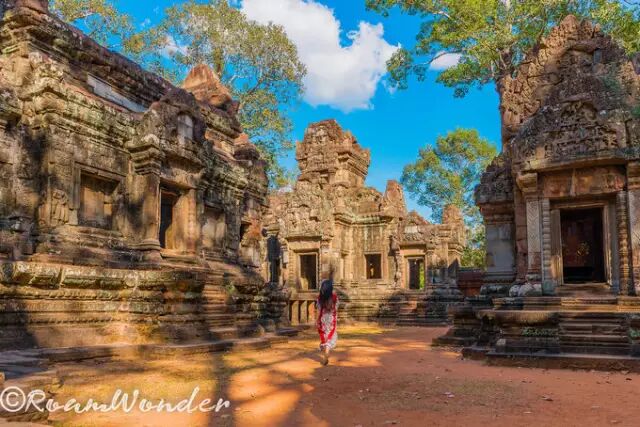 【塔普伦庙 Ta Prohom】(约60分钟),电影(古墓奇兵)以此为场景拍摄,有巨大的树木盘结在围墙庙门口,更视为奇观。百年老树缠绕着千年奇石,彷佛爱恨纠缠般的浪漫。【班蒂斯蕾古剎 Banteay Srei】(约60分钟)又名 【女皇宫】 位于大吴哥东北面21公里,距离省会35公里的 建于十世纪,公元967年时值加亚华罗曼五世王朝,此地为尊奉婆罗门教三大主神之一的—【湿婆神】。由于建造此座古剎的石头为美丽的粉红色,此庙壁画的雕刻是所有吴哥古迹中最精致细美的,其中最令人赞赏的是创作者竟能将坚硬的石块,如雕刻木头般琢磨出层次分明线条柔纤的精细作品,不论门楣或石壁或窗棂,都刻镂的一丝不茍巧夺天工,妙不可言,是吴哥所有寺庙中石雕作品最上乘,也是柬埔寨艺术的颠峰之作,故又有「吴哥艺术之钻(Jewelin Angkor Art) 的美誉。