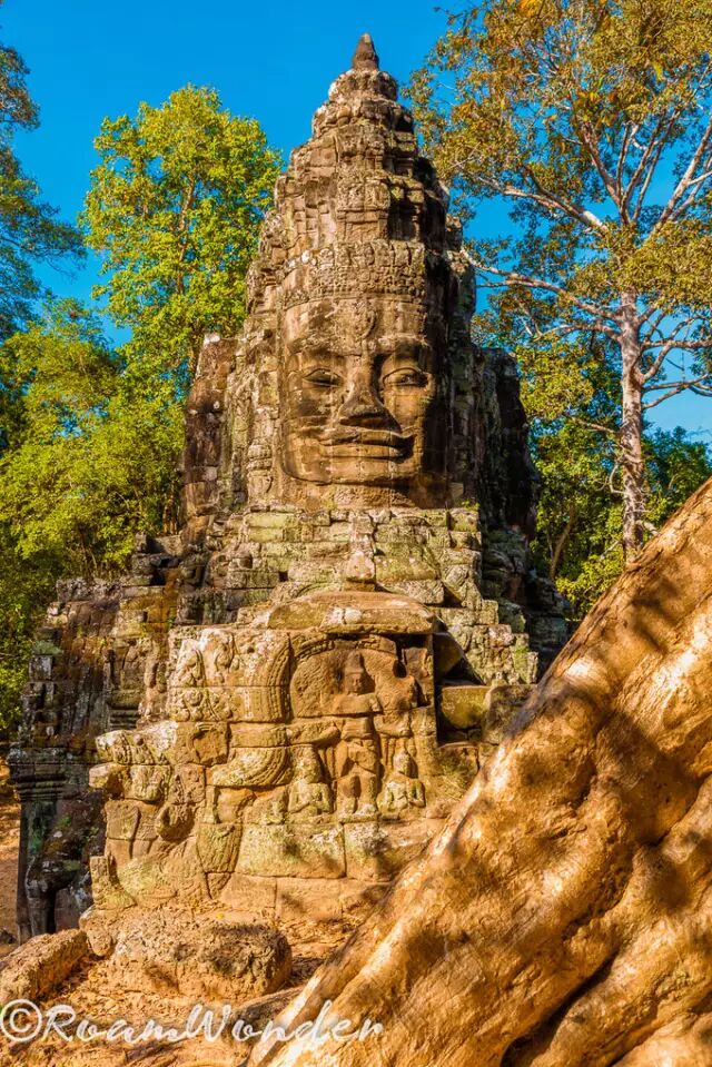 【大吴哥城Angkor Thom~南城门】在进入都城前,远远便会看到高达七公尺的南城门大石雕上头,四面都刻着吴哥王朝全盛时期国王加耶拔摩七世的面容,唯与印度教不同的是此乃象征眼观四路耳听八方的四面佛菩萨。无时无刻送暖关注您的意思。