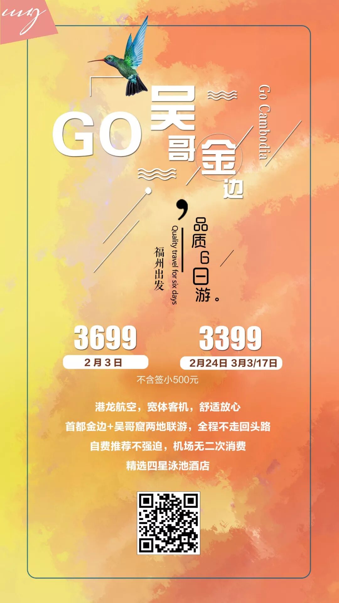 1、交通:福州-暹粒/金边往返机票(不可改期、不可签转、不可退票),当地旅游用车;