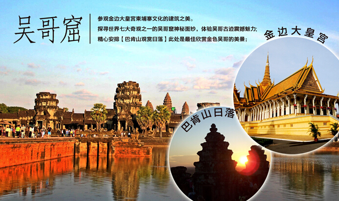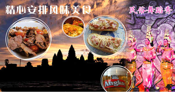 早餐后前往参观【金边国家博物馆】,建于公元1913年,馆内收藏了很多金边不同时期的手工艺品及雕刻艺术品,就连吴哥窟雕塑的真品亦有在这里展出。博物馆充满了异国风味,其开放式设计使之十分美观。,你会发现这里供奉了一尊佛像,周围有四个人造荷花池,以草圃及长凳相间,与馆外闹市形成强烈对比。后前前往机场飞往(昔称高棉)之暹粒省(Siem Reap)【吴哥窟AngkorWat】,抵达后参观【柬埔寨民俗文化村】特别安排贵宾在进入吴哥窟之前,先行了解柬埔寨这个国家历史、民族文化的缩影,文化村占地21万平方米,现有11个风俗各异的民俗村寨,浓郁的民族色彩外,并于博物馆内以硅胶塑像展示古高棉人当年建筑吴哥窟的生动场景,犹如时空隧道般的回到过去!晚餐特意安排民俗文化村民族舞蹈秀+自助餐,边吃饭边欣赏魅力的吴哥文化表演,让你高兴不已!