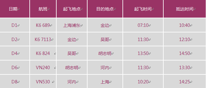 集合与浦东国际机场搭乘吴哥航空公司航班直飞柬埔寨首都金边。旧名高棉王国的柬埔寨于公元9-14世纪是为东南亚最强盛的国家之一,不但在经济或是宗教等各方面都十分的强盛。而几经政局摧残之后。现在金边还留存以往辉煌时期的风华痕迹和血腥历史的刻痕。那现在的金边是用何种的风貌展现在你我的面前呢 ? 带着期待的心情抵达金边国际机场入境通关手续,前往参观高棉王国【大皇宫】,及金碧辉煌的【金银阁寺】,欣赏柬埔寨文化的建筑之美,让你细细聆赏柬国独具佛国特色的建筑及传奇的神话故事,让您更深入及完整了解柬埔寨过去辉煌历史,并让寺内之国宝玉佛金佛赐福予您。接着参观金边市的精神堡垒【独立纪念碑】,,建筑溶合柬埔寨文化及历史,是高棉独立的标志。而后接着登上「金边」之名由来的出处【塔仔山】,在此就由当地土生土长的导游们为您解说一段古早流传下来的民间传奇故事!在此并参观著名的【钟形塔】,鸟瞰金边市容,此处更为金边市民祈求好运的福地。今晚上您可以前往赌场小试手气、搏杀一番、领略当赌神的神韵!