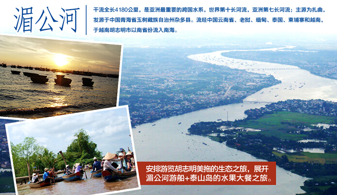 早餐后前往湄公河三角洲,距离胡志明市市南方约70公里的【美托My Tho】一览九龙江平原上水道交错的水乡风貌。是湄公河三角洲的入口城镇。以盛产龙眼、菠萝、芒果、波罗蜜、释迦、椰子等水果而闻名。来到美托旅游最精彩的便是湄公河水上观光,搭上装着小马达的木船,向小岛出发!一边眺望着两岸的丛林,一边在混浊的湄公河滚滚水流中前进,欣赏船上堆满了水果的小船、默默打鱼的渔夫,悠闲的让清凉的风吹尽心扉吧!在美托最主要的活动是搭船到泰山岛享用水果大餐、搭乘独木舟游览湄公河三角洲。午餐于美托市区安排享用皇帝鱼、越南粉卷及恐龙蛋等越式风味餐。午餐后返回胡志明市市,参观【】法国殖民时期所留下来的产物,最具特色的建筑,也是法国在越南的首间邮政总局,自1892年正式启用至今,不知不觉已有超过一百年的历史了。晚上乘船夜游西贡河,您可一边享用美食,一边欣赏歌舞表演及延岸的夜景以及歌唱表演,夜晚的西贡河映着岸边大型的霓虹灯招牌闪烁的彩光,简陋的木船穿梭在邮轮间,奇妙的对比为胡志明市市写下最贴切的批注,深具特色。