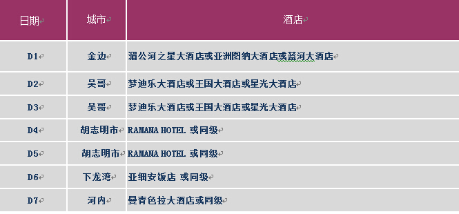 早餐:酒店内 午餐:义纪南洋料理 晚餐:越南风味料理