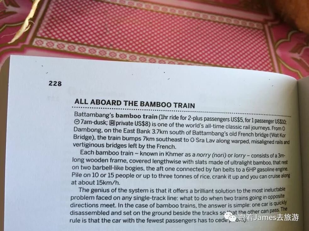 我们非常有幸坐得是这个VIP2016号的车子。下面是关于bamboo train的英文介绍,推荐Lonely Planet的自由行书籍。老外都是人手一本,堪称自由行的Bible()