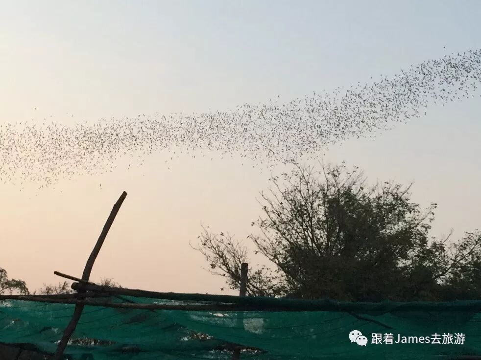 纪念完历史后,沿着洞口一直往外走,会看到一个壮观的景象,建议有密集恐惧症的人就直接放弃这个安排,如下图所见每晚六点,百万只蝙蝠出来觅食,一直会持续到深夜十二点,整整齐齐的蝙蝠壮观到难以令人置信。Tips:周边有一个卖水果的摊头,只有两张桌子,早点过去买了水果之后坐下来静静等待。每天蝙蝠出没的时间会随日落时间改变而不同。