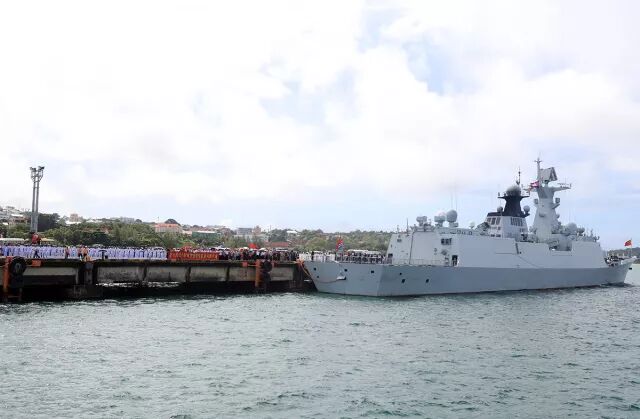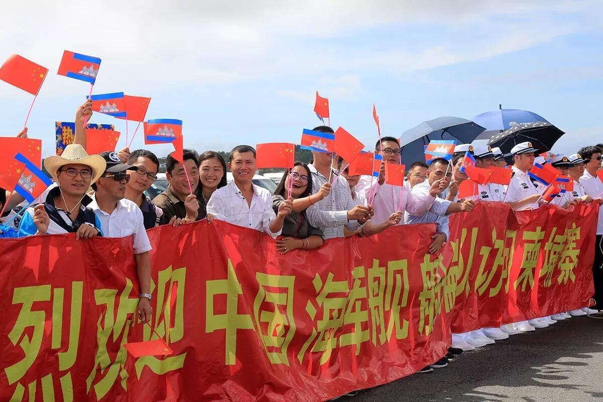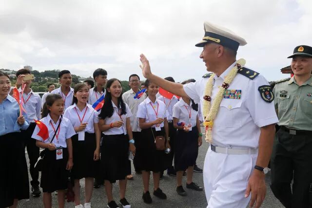 柬埔寨海军在码头举行了隆重仪式欢迎中国海军编队到访。柬云壤海军基地副司令罗威斯纳少将,中国驻柬埔寨大使熊波、国防武官李宁亚,柬海军官兵和民众代表,使馆馆员、援柬军事专家、华人华侨、中资机构代表等500余人在码头迎接。