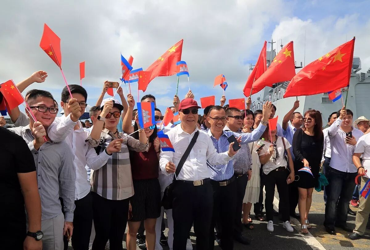 柬埔寨小学生挥舞两国国旗欢迎中国海军到来