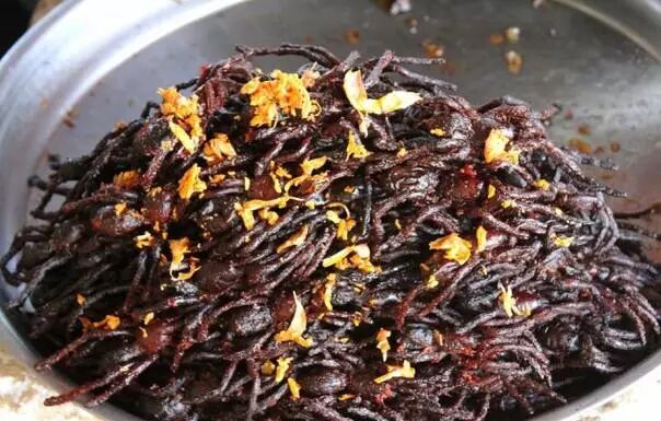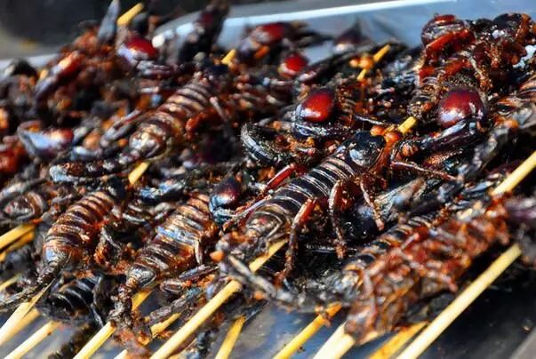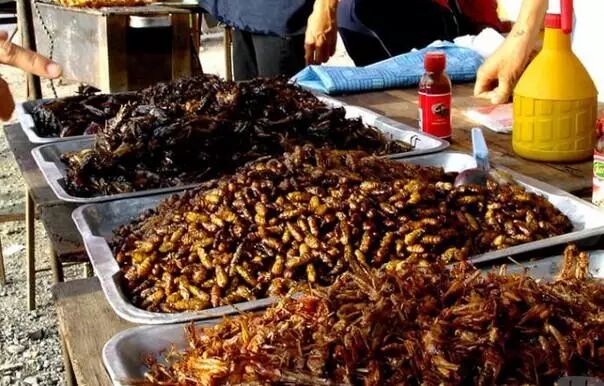 有一个专卖昆虫小吃的摊位,摊上摆着炸蟋蟀、蚕蛹和水虱,生意相当好。摊主一天可卖出20~30公斤昆虫小吃
