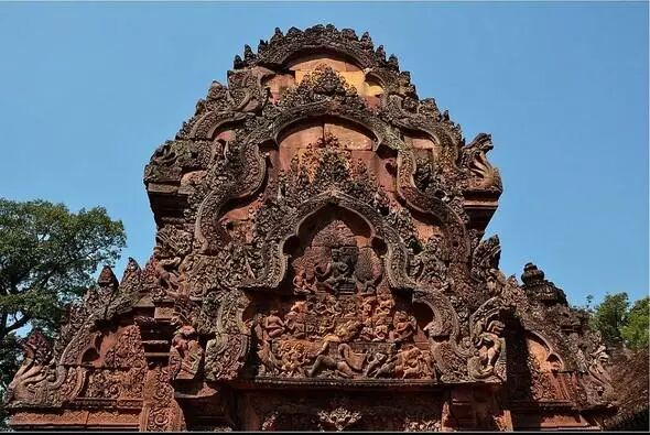 女王宫以艳丽的色彩和精美的浮雕著称于世,是吴哥古迹中风格最独特和最精致的建筑群之一。