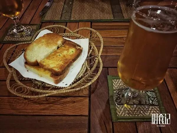 面包篮里是烤的酥脆的香蒜面包片,赠送的饮料自然还是选啤酒。