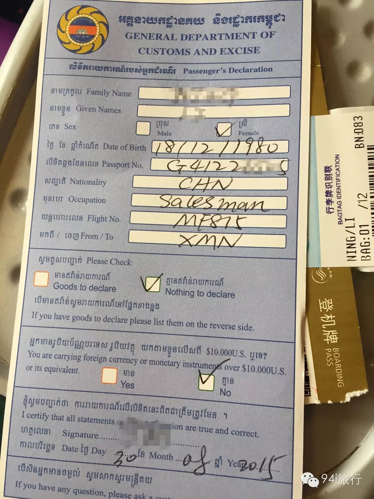 在飞机上,你可以填写入境卡,如果是跟团游的客人,就不需要自己填了(旅行社都帮你写好了)