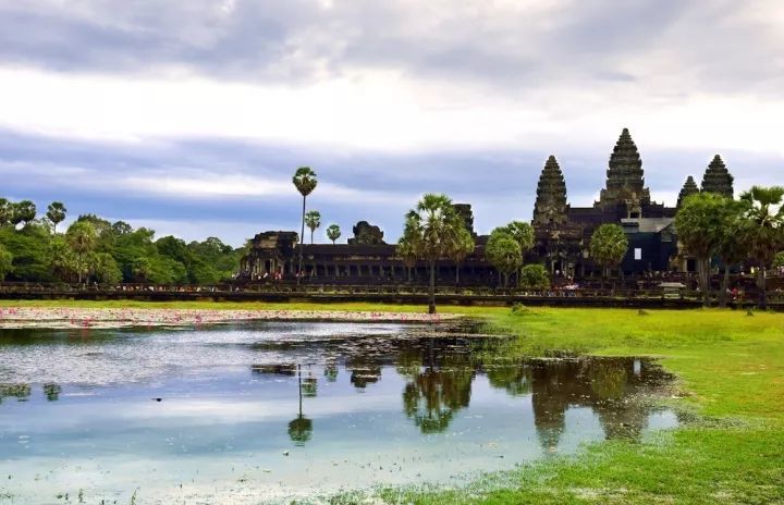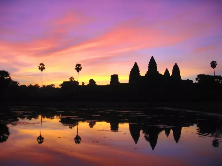 吴哥窟有极美的日出日落,当第一缕阳光穿过吴哥窟的尖顶,水池中倒映出五座塔尖,花朵在池水里盛情地绽放,美得不可思议。