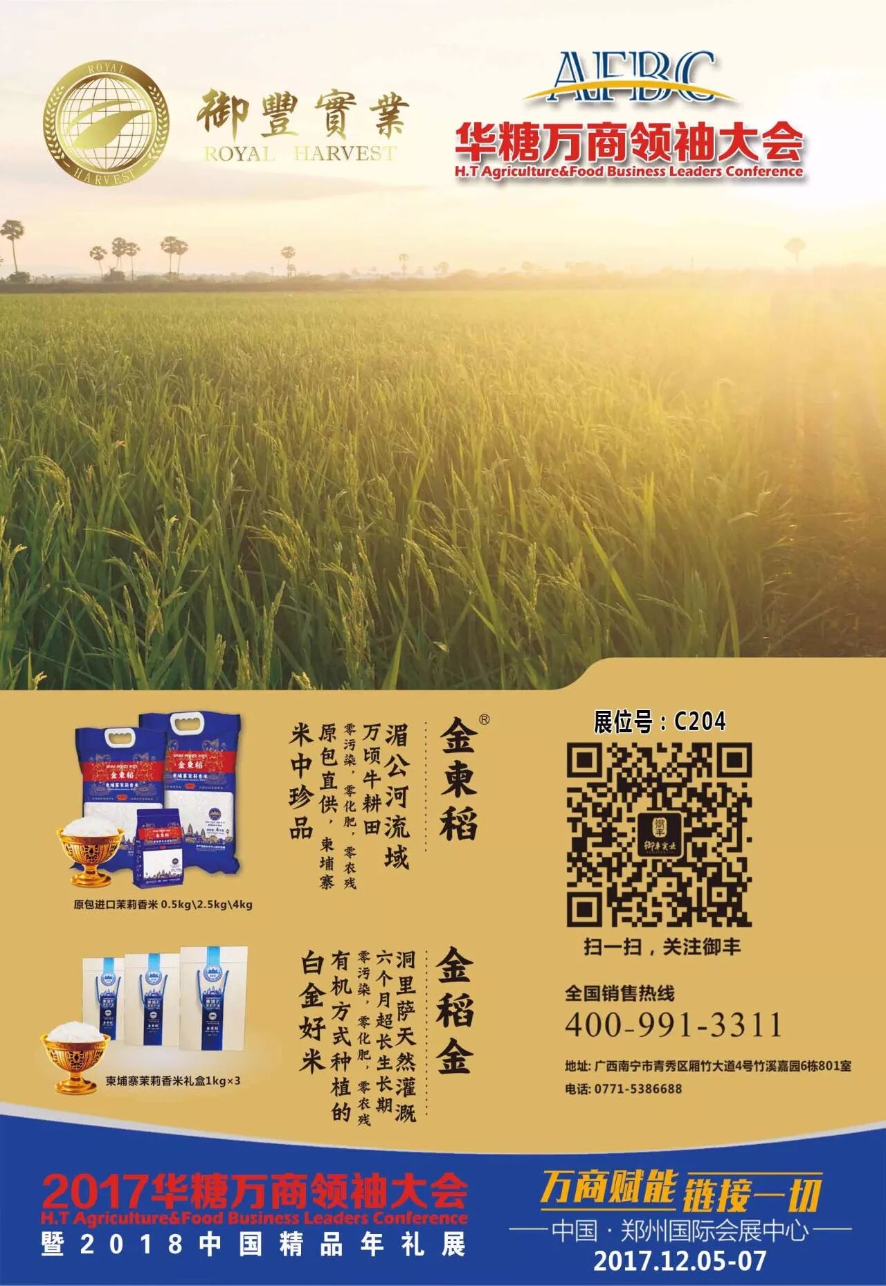 作为优质进口大米运营商,御丰实业将于12月5日在郑州会展中心一号展览馆布展,展位号为C204,届时将与参会的全国经销商代表,共话柬埔寨优质大米的商机“新蓝海”。
