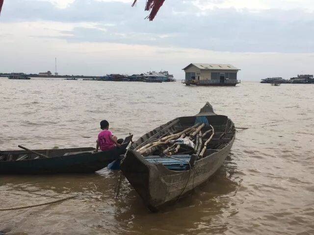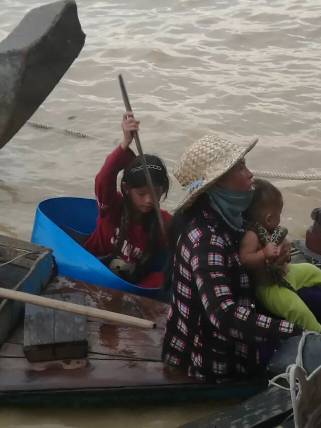 乘上小船在洞里萨湖游玩,船主的小孩会主动给你做按摩以获取小费。