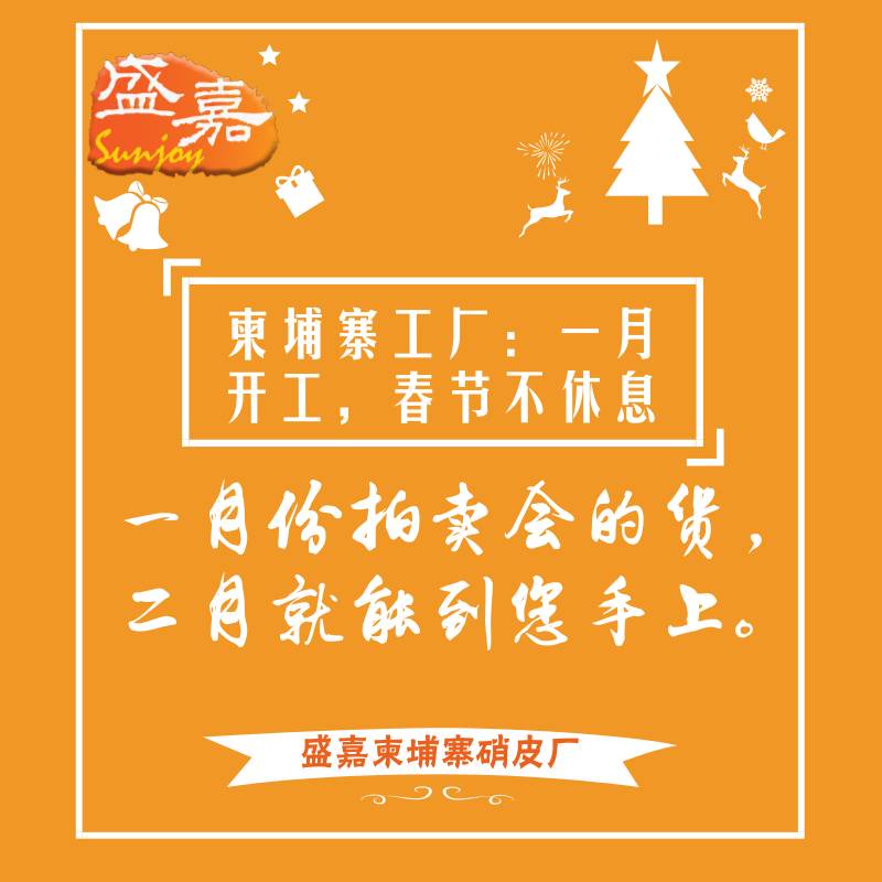 盛嘉柬埔寨硝皮厂一月份开工,春节不休息,所以,1月丹麦拍卖会(8-11号)客户购买的皮张,2月份就能顺利到达客户手上。