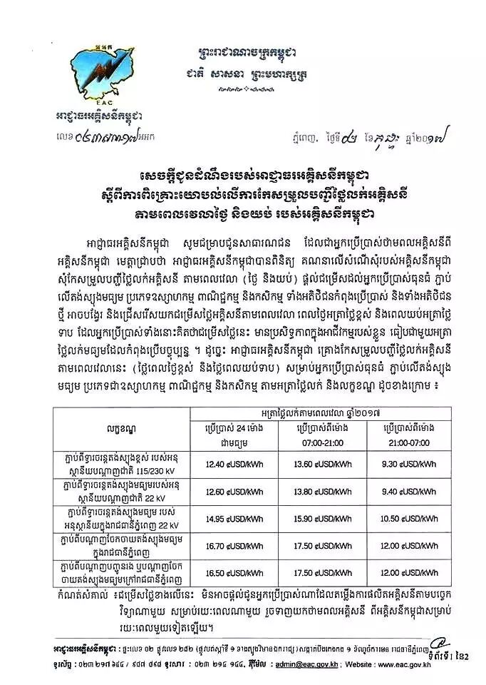 根据新收费制,金边大型用户日间(上午7时至晚上9时)电费为每度0.136美元,而夜间(晚上9时至早上7时)则为每度0.093美元,这使到平均电费下降至每度0.124美元。
