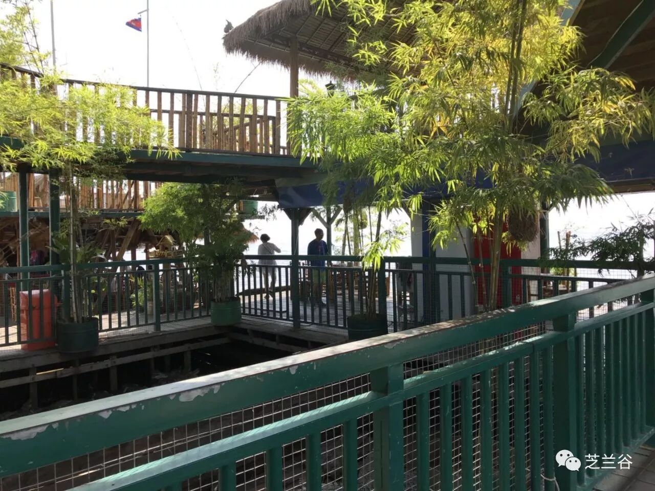 柬埔寨也有面子工程,河流进入洞里萨湖的入口处由政府建造了一个绿竹怀抱、上下层的休憩“庭园”,实际上是一艘面积颇大的浮船。上面可以喝茶,还有当地民族特色工艺品出售。“船舱”下层还展览许多鳄鱼。