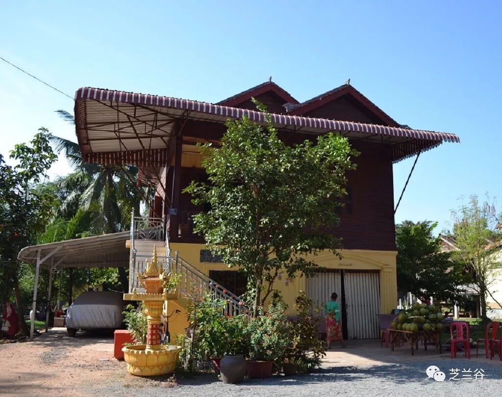 柬埔寨民居不少是吊脚楼。上图是差一些的茅草吊脚楼,下图是好一点的砖瓦吊脚楼,陆地上有钱的住家也有水泥桩柱、砖木结构的。之所以要“吊脚”是防潮,穷人家也用来豢养牲口。