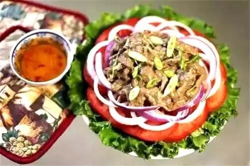 酸橙长得有点像黄柠檬,但味道带一点点苦,刚好中和了寡酸味,和鱼露、蒜头、罗勒、青酱、新鲜辣椒、绿豆渣混合以后,淋到烤熟的牛肉上拌匀,就是高棉特色的沙拉。