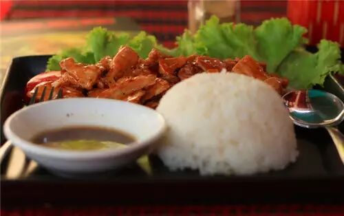 “寨子”里的猪肉饭,跟咱们国家的猪肉饭还是有一定的区别的,寨里人的猪肉饭,是把猪肉切薄片,用蒜、黄姜打成汁,配合胡椒、盐巴做成腌料,腌制一晚上,用炭火烤熟后,盖到熟米饭上,再弄上一碟子各种蔬菜、豆角做成的泡菜,放上几片小番茄这么来吃的。泡菜汁水很重要,用来淋在米饭上拌一拌,解烤猪肉的腻。