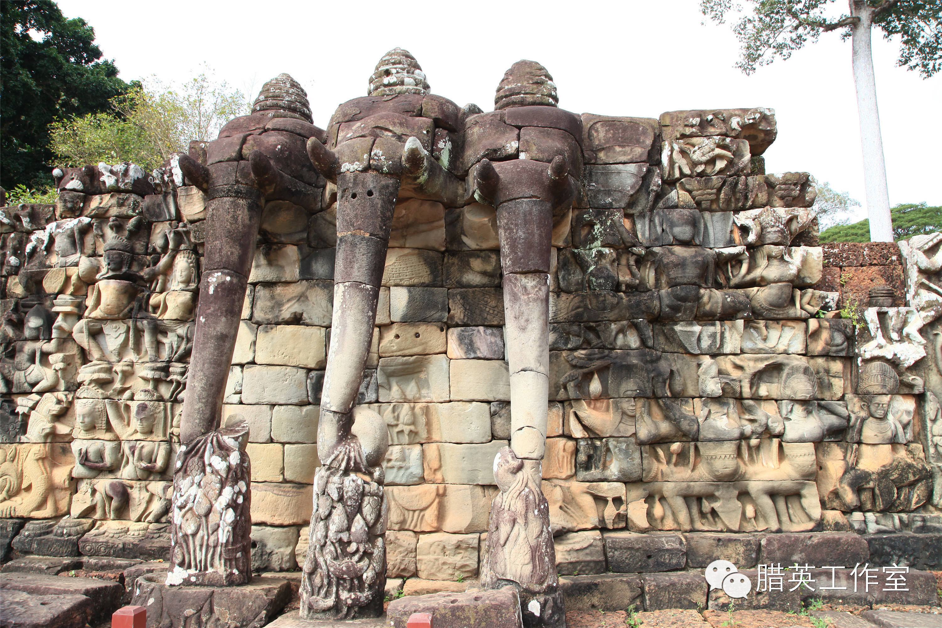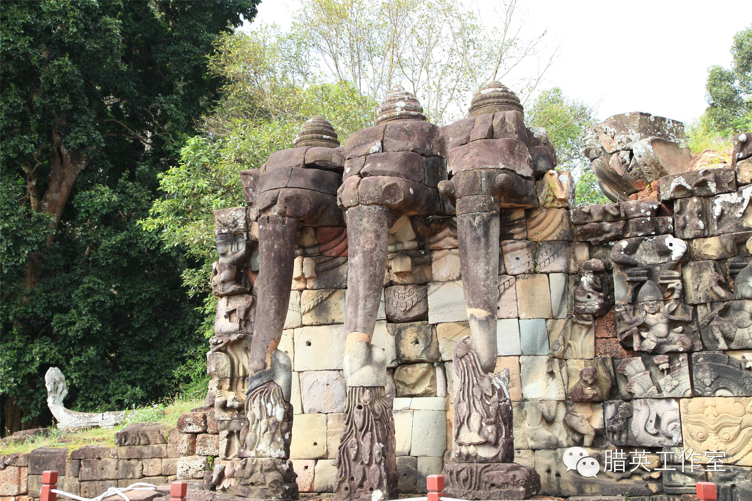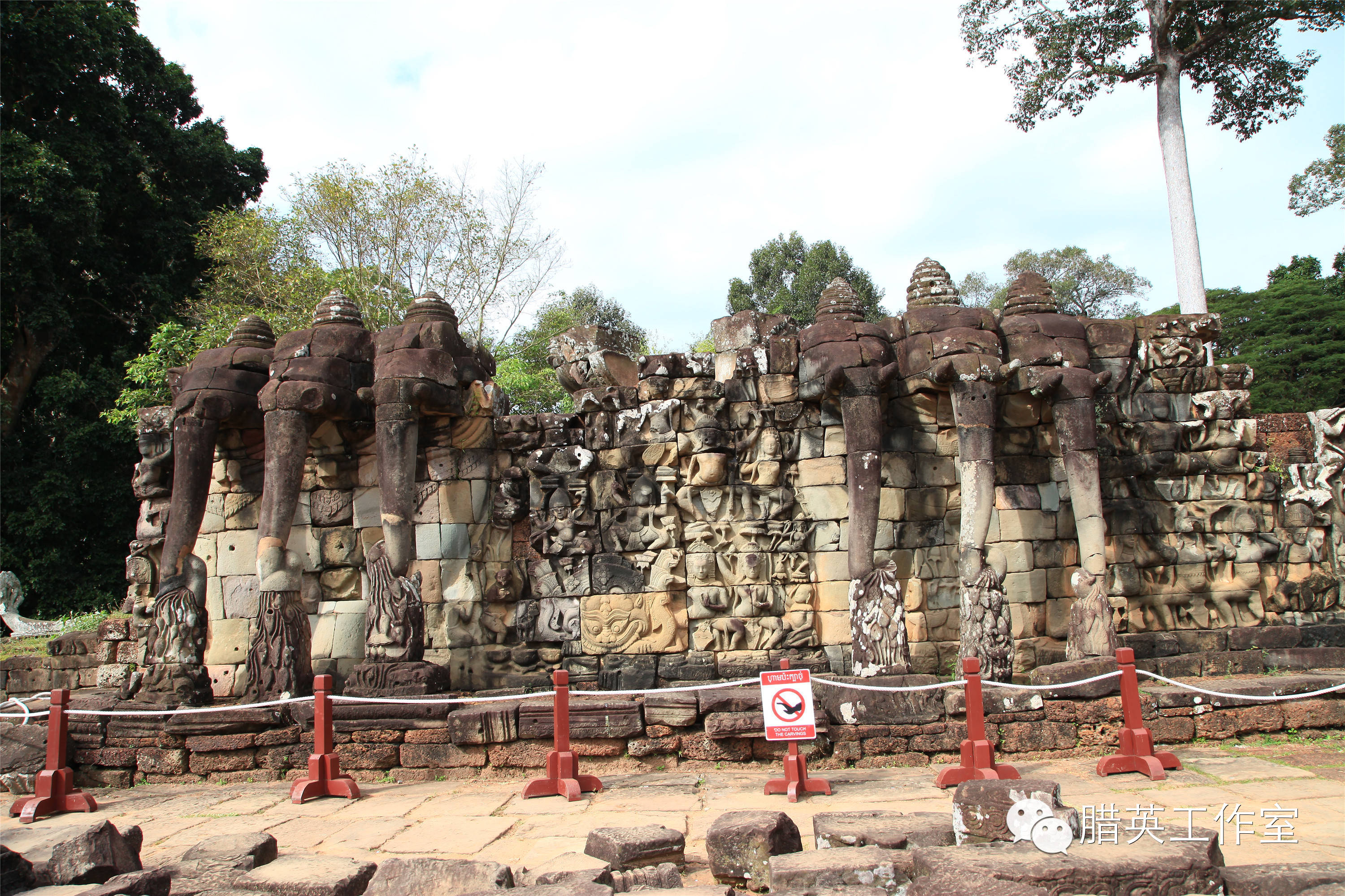 ,建有宫殿、图书馆、浴场、回廊等。,还有长约300米的著名建筑——象台,原本矗立着带有金色框窗户的木制亭子。据说是当时国王检阅部队的阅兵台。一个大台,两个小台。大台左右两侧置有石象。南部的梯级以三头饰的大象为柱,象鼻卷著莲花。象台的外观,主要是厚皮动物如大象、犀牛、河马等图饰,栩栩如生。古代的吴哥国王,站在斗象台上作检阅,举行各种公共仪式,马队、车队、象队,鱼贯在广场上走过。