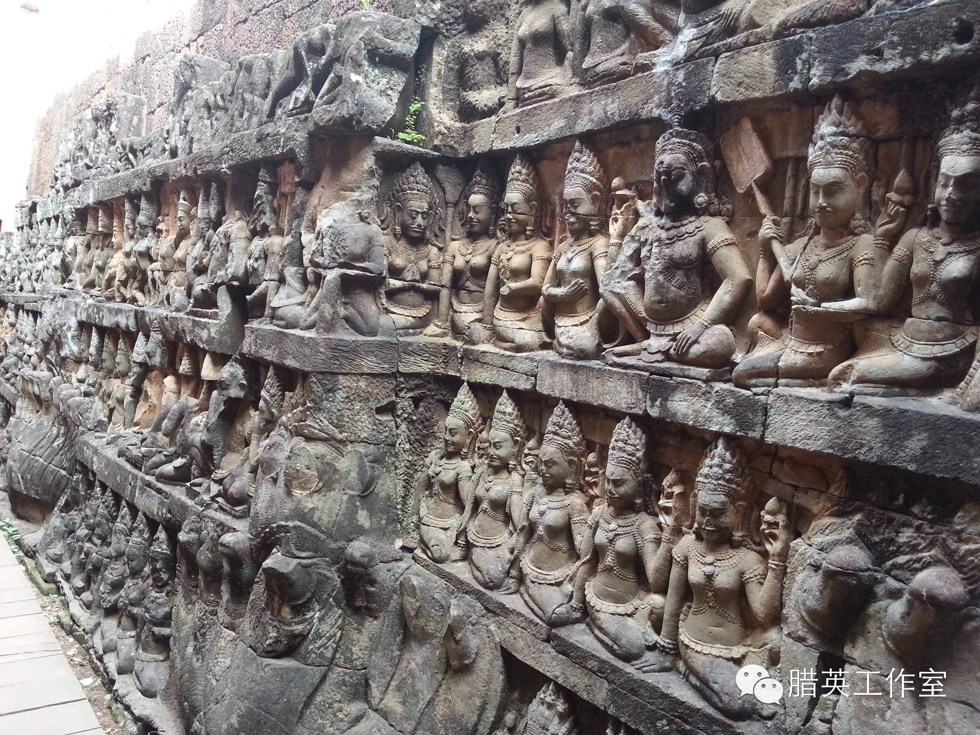 前护墙饰有7层精心制作的雕刻,包括无数的阿帕莎拉(舞女或者天仙)。更蔚为壮观的是前护墙后隐蔽的壕沟里那些表情邪恶的形象。数世纪前因为最初的坛台扩建,这些雕像被掩埋起来,所以看起来依然光鲜,就像昨天才雕刻出来的似的。