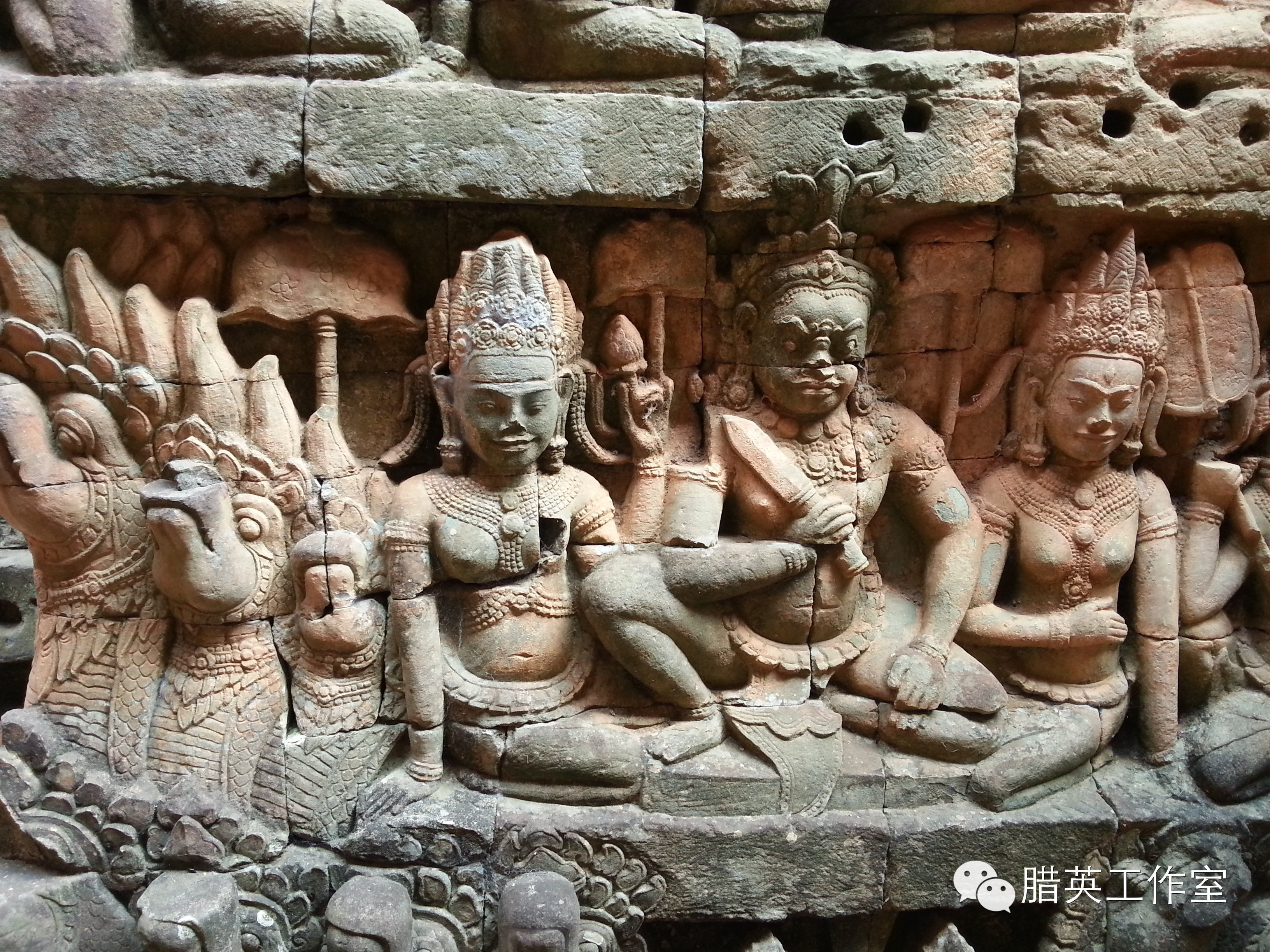 寺庙的墙壁上仍保存着丰富且生动的雕刻,举凡古代战争记述、寻常百姓之生活百态、洞里萨湖之湖畔风光等皆充分透露着当时之情景,绝对是不可不看的珍贵史迹。那一幅幅活灵活现的壁画彷佛诉说着一段段遥远的故事。很可惜,有些雕刻我们没有看到。