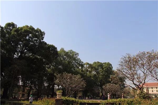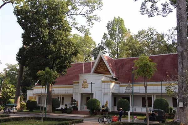暹粒市中心国王行宫所在的广场,有漂亮的鸡蛋花和落满蝙蝠的高大树木。