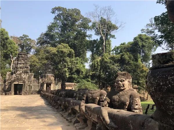 大吴哥城外修护城河,通往城门的桥上两侧分别是修罗与阿修罗,拉着“蛇王”演绎着“搅拌乳海”的印度神话故事。