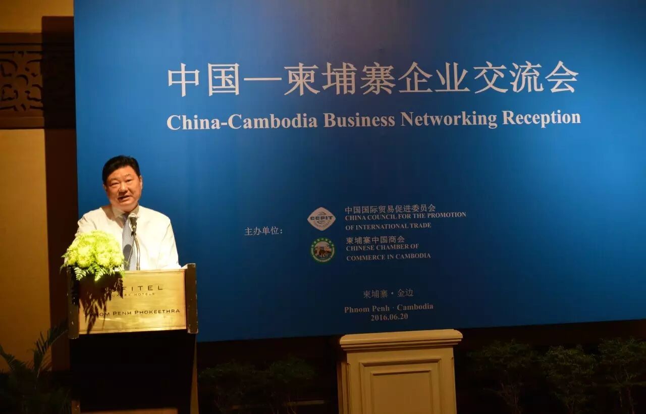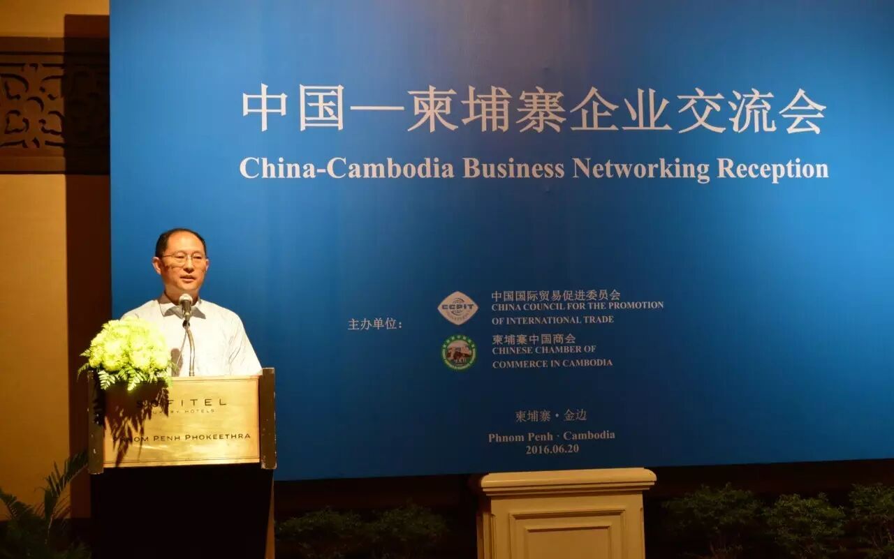 6月20日下午,中国贸促会副会长卢鹏起率贸易投资促进代表团在柬埔寨金边出席中国-柬埔寨企业交流会。,柬埔寨中国商会会长高华出席交流会。中国贸促会组织的20余家企业代表与中国银行、中兴、上海建工、中国通信服务等当地中资企业代表参加交流会。会议由中国贸促会贸易投资促进部副部长朱凌燕主持。