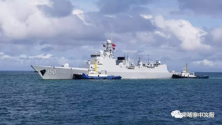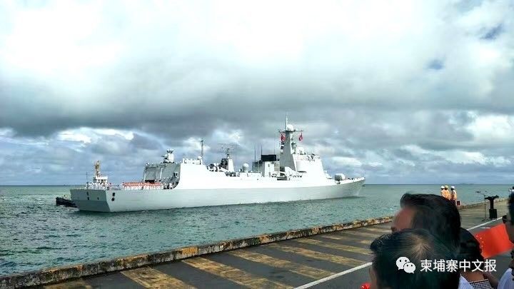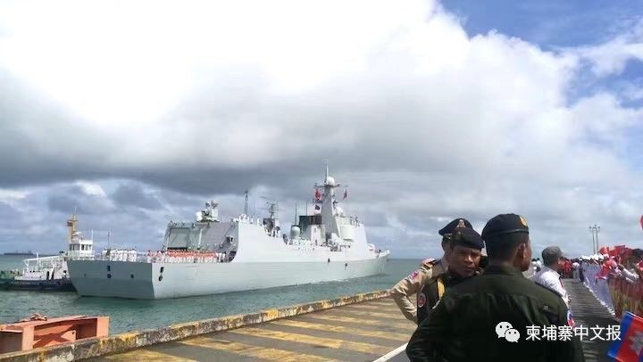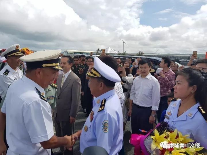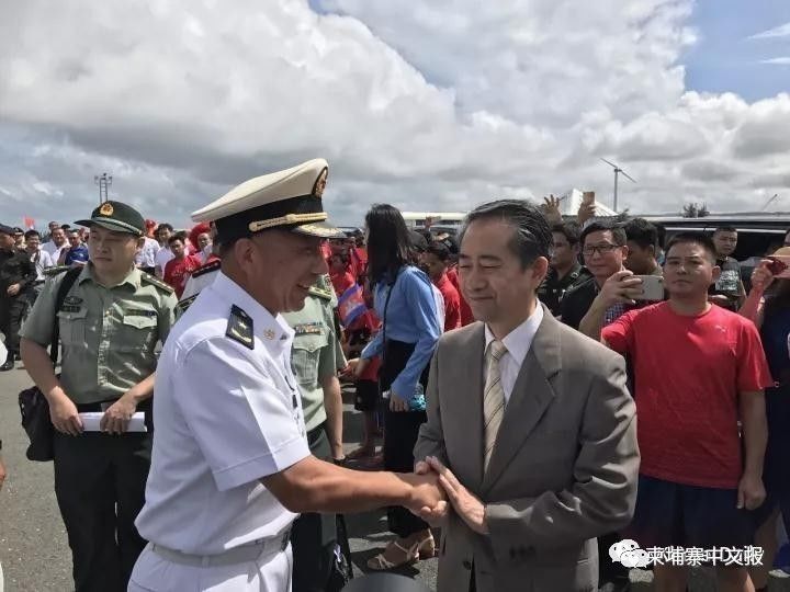 上午10时,、。柬埔寨海军在码头举行了隆重仪式欢迎中国海军编队到访。柬云壤海军基地副司令罗威斯纳少将,中国驻柬埔寨大使熊波、国防武官李宁亚,柬海军官兵和民众代表,使馆工作人员、援柬军事专家、华人华侨、中资机构代表等500余人在码头迎接。