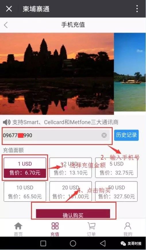 然后,就可以使用“柬埔寨通”手机充值啦,以下是步骤说明(以Smart卡为例):