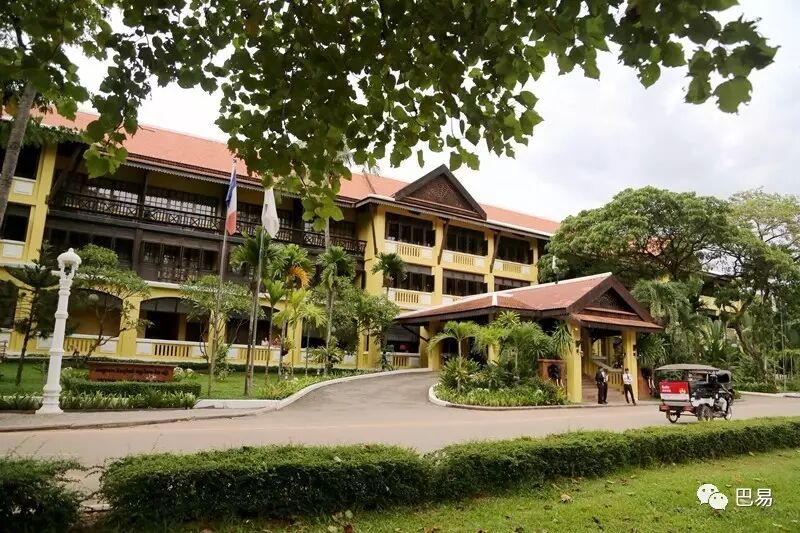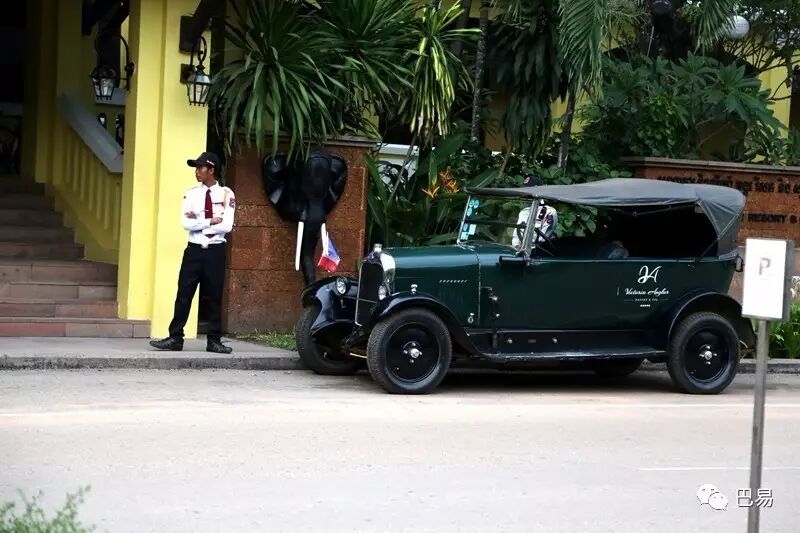 草坪上,4个来自欧洲的客人在做瑜伽,还有个当地的姑娘独自坐在那里,也许是在思念心中的他;石凳上一对青年男女在打情骂俏,续写着爱情篇章;皇家行宫前的一辆老爷车格外显眼;三层的皇家行宫看上去仍然富丽堂皇;广场边上用中文写着“吴哥购物中心 奥特莱斯精品”格外醒目,好像专门为中国人建的商场。