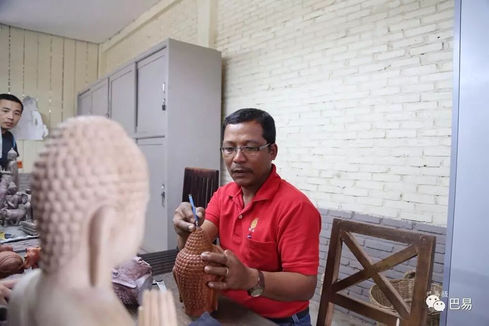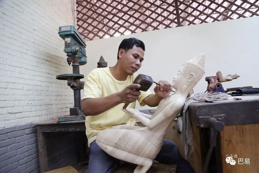 艺术学校实际是一个手工作坊,设计人员把设计好的图纸交给技术工人,经过他们精心雕刻,一件件具有高棉风格的精美艺术品就会展现在眼前。我不断地把镜头对准他们,记录了这种精益求精的敬业精神。最后来到展厅,木雕、银饰、陶器等作品琳琅满目。