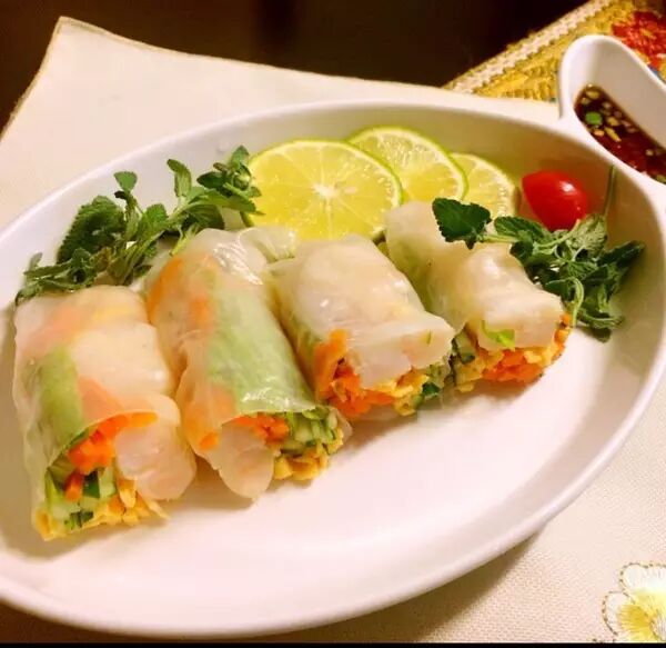 柬式春卷类似我们的卷煎饼,新鲜的蔬菜卷在薄薄的煎饼里蘸着调料吃,各家的馅料、蘸料都不一样,味道也很好。
