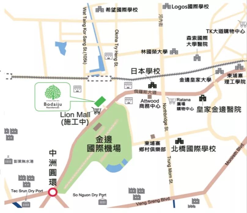 菩提周边机场商圈林立,稳定且快速成长,同时柬埔寨最高端的经济特区近在咫尺,例如Lion Mall ,一个以休闲为主,集时尚、餐饮、娱乐于一身的一站式小费场所;拥有世界级的马来西亚百货商场百盛及金边医院和北桥国际学校也只需几分钟到达。