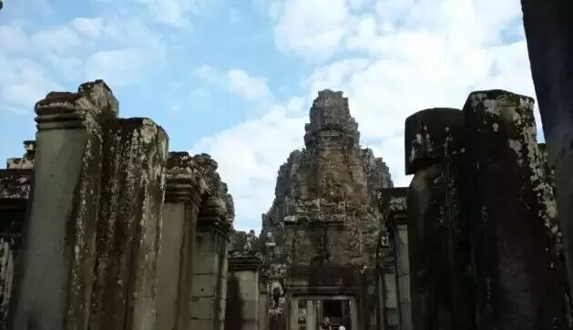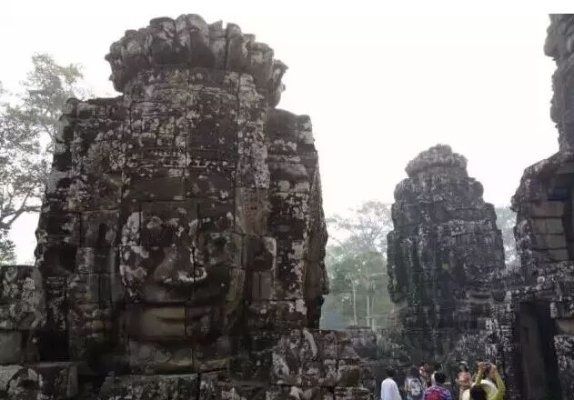 穿过长长的廊道,在吴哥城的中心吧,巴戎庙层层叠叠像一座石头山般地耸立着。大概浏览了那个著名内廊宗教传说外廊世俗生态的回廊壁画,便从陡峭的石梯攀爬到寺顶去看高棉的微笑。寺顶上的数十座佛塔每一座的四个方向通统雕刻着微笑的佛脸,无论走到哪里、无论从哪一个角度看,每一张庞大的佛脸都面带微笑。那是一种全世界独一无二的、代表高棉民族友善的、绝不输给蒙娜丽莎的、永恒的微笑。